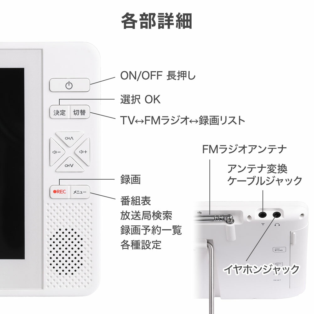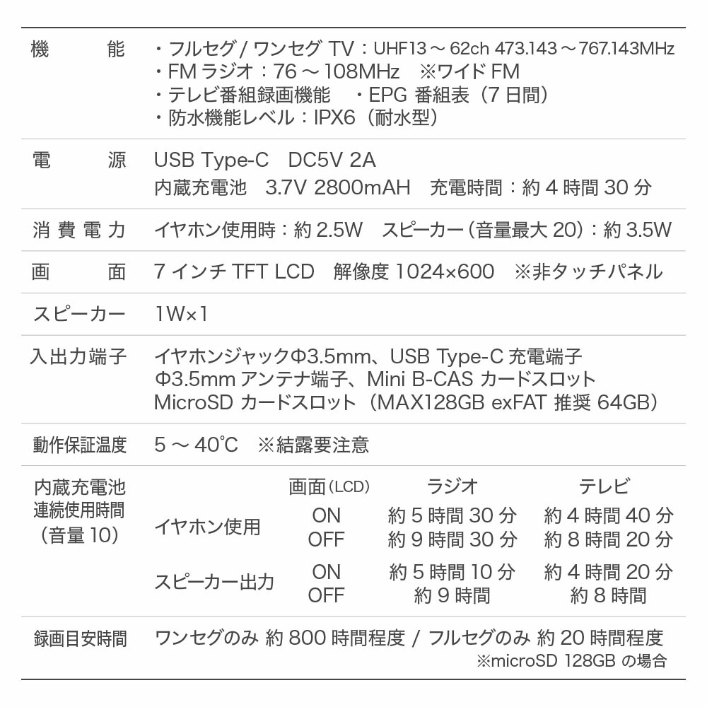 入出力端子:電源入力充電端子、イヤホン出力端子、変換ケーブルアンテナ入力端子、mini B-CAS カードスロット、microSD カードスロット (MAX128GB exFAT)