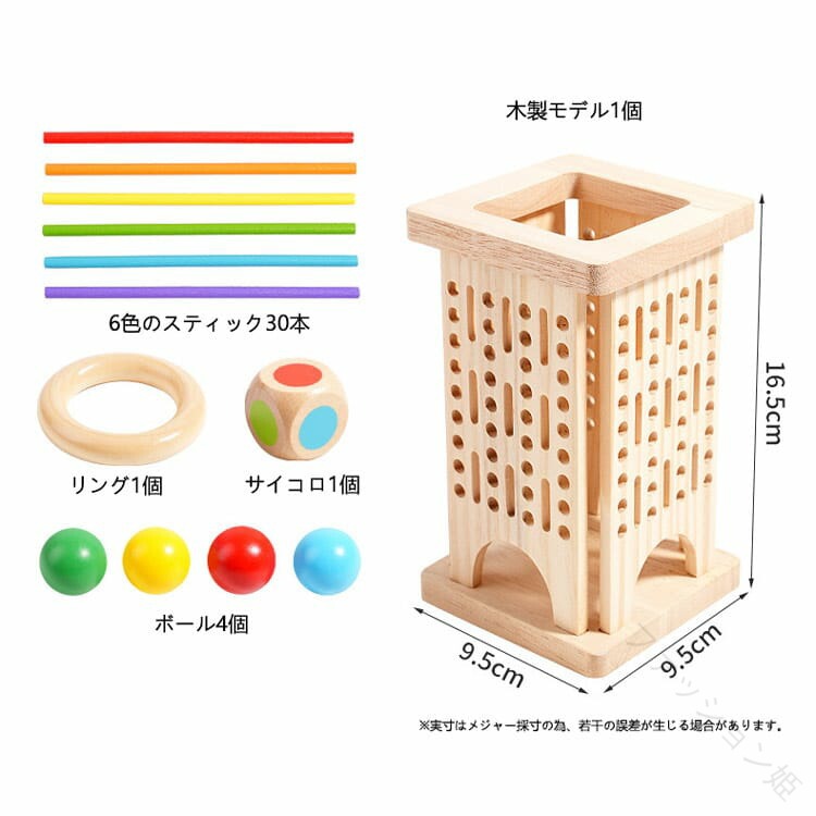 サイズ:6色のスティック30本、リング1個、サイコロ1個、ボール4個、木製モデル1個(9.5*9.5*16.5cm)。