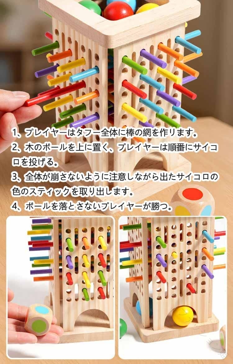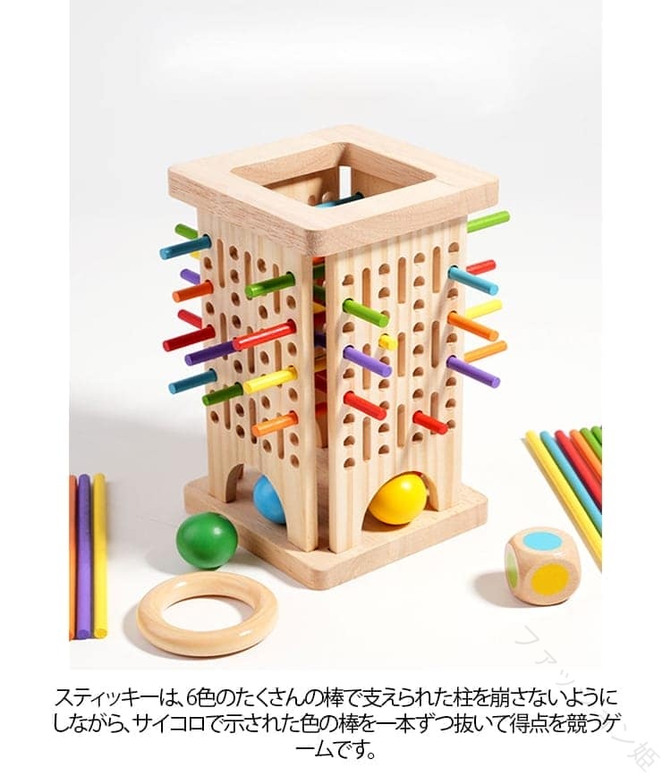 スティッキー バランスゲームスティッキーは、6色のたくさんの棒で支えられた柱を崩さないようにしながら、サイコロで示された色の棒を一本ずつ抜いて得点を競うゲームです。テーブルの上で行うと、つるつる滑るので難易度を下げる時には布やコルクを敷くと、崩れにくくなります。スティックの束が倒れないように1本抜き取ります。どのスティックが抜きやすいか、よーく観察してね。ルールが簡単なので幅広い方にお楽しみいただけます。お誕生日会やパーティー等でとっても盛り上がります。ご家族やお友達みんなで楽しく遊びましょう。遊び方ー11、全てのスティックを束にして片手で握ってください。2、木の輪を束の上から通して真ん中まで下ろし、ゆっくりと束から手を離して下さい。3、全体が動かなくなったら、ゲーム準備が完了です。4、プレーヤは順番にサイコロを投げて下さい。5、全体が崩さないように注意しながら出たサイコロの色のステイックを取り出して下さい。6、全体が崩したら(または、スティックが3本しか残らなかった場合)ゲームは終了します。全員は自分の得点を計算し、最も得点が高い人は勝ちです。遊び方ー2プレイヤーはタフー全体に棒の網を作リます。木のボールを上に置く、プレイヤーは順番にサイコロを投げる。全体が崩さないように注意しながら出たサイコロの色のスティックを取り出します。ボールを落とさないプレイヤーが勝つ。