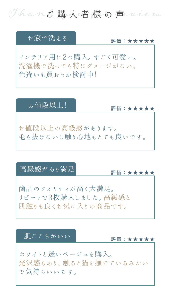・リビングのフローリングに敷いたり、ソファにサッと掛けてもオシャレ。来客用のお部屋のアクセントにはもちろん、寝室でリラックスタイムを過ごす時にも。