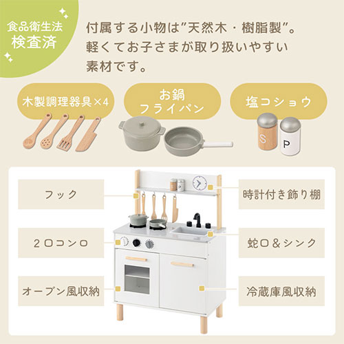 おままごと ごっこ遊びトイ キッチン 台所 子供用 キッズ お店屋さん 料理屋さん ご飯屋さん 小物セット すぐ遊べる 収納棚 お片付け おもちゃ 食品衛生法検査済 おしゃれ ホワイト×ナチュラ 木製