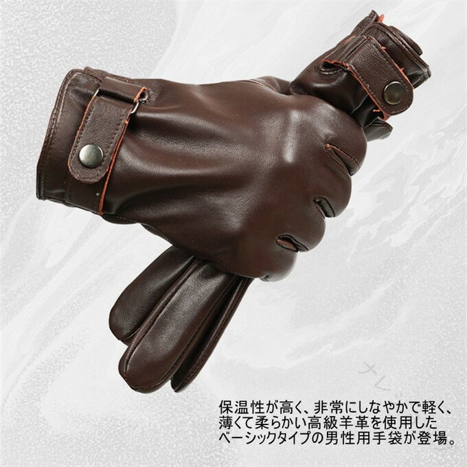商品詳細【カラー】:ダークブラウン ブラック ブラウン【サイズ】(cm):S 手囲い約19~20 M 手囲い約20~21 L 手囲い約22~23XL 手囲い約24~25【素材】 表地:羊革(本革) 裏地:(ポリエステル100%)【スマートフォン対応の可否】:(対応:全カラー・全指)【生産】:中国【商品説明】:保温性が高く、非常にしなやかで軽く、薄くて柔らかい高級羊革を使用したベーシックタイプの男性用手袋です。一般的なレザーよりも非常に高い伸縮性を持ち、使い込むうちに手に馴染みフィット感が増していきます。スッキリとしたフォルムの立体裁断で手に馴染むように職人がこだわった丁寧な仕上がり。裏地は肌触りに優れたベルベット素材を使用しています。柔らかな肌触りと手を入れた瞬間から暖かく包み込んでくれます。全指にはタッチパネル加工が施されているのでスマホ、タブレットなど寒い中でも着用したまま使用することができます。シンプルなデザインでフォーマルからカジュアルまでどんな装いにも寄り添ってくれます。【使用している革の特長】:シープスキンの魅力は、なんといっても柔らかな手触りです。他の革に比べると強度や耐摩耗性は低くなりますが、しっとりと柔らかく、手に吸いつくように感じられます。シープスキンは柔らかいですが、銀面は丈夫なので、高級手袋やジャケット、コート、インテリア用品などに重宝されてきました。。【関連キーワード】:(無料ラッピング)ラム革 レザーグローブ レザー手袋 革手袋 本革 羊革 皮 てぶくろ スマホ対応 スマホ手袋 男性用 紳士 高級 秋冬 大きいサイズ 通勤 通学 シープスキン 防寒 黒色 ブラック ブラウン 裏地付 オシャレ おしゃれ かっこいい 美しい プレゼント ギフト 20代 30代 40代 50代 60代 父親 母親 娘 息子 祖父 祖母 義母 義父 旦那 夫 奥さん 妻 主人 彼氏 彼女 恋人 ビジネス 敬老の日 ギフト プレゼント クリスマスプレゼント 誕生日プレゼント バレンタインデー 【参照用途】デイリーユース/カジュアル/普段使い/タウンユース/お出かけ/お出掛け/釣り/寒冷地/雪国/雪かき/山/登山/ハイキング/オーロラ/流氷/買い物/ショッピング/旅行/レジャー/イベント/贈り物/ギフト/プレゼント/お祝い/御祝い/クリスマス/Xmas/誕生日/birthday/誕生日プレゼント/クリスマスプレゼント/防寒対策/寒さ対策/秋/冬/秋物/冬物/冬の手袋/秋冬小物/秋冬雑貨/秋冬手袋/ファッショングッズ/グッズ/アイテム/コーディネート/コーデ/おしゃれコーデ/ファッションコーデ/リンクコーデ/小物/雑貨※注意事項・天然革を使用している為、商品に<天然のキズ><トラ・シワ><黒点>が出る場合がございます。革1つ1つの個性のためご了承ください。(上記に当てはまる場合は、ご返品をお受けできませんので、ご了承ください。・製品の個体差や、計測の位置により、掲載の数値より数mmのずれが生じる場合がございます。・長期間保管するときには、陰干しして湿気を抜いてから、防湿剤・防虫剤とともに袋に入れて密封して保管してください。・水に濡れたときには乾いた布で水分をふき取り、直射日光をさけ、自然乾燥させてください。・商品のカラーや素材感は実際のものに近づけるように努めておりますが、撮影状況やディスプレイの状況等から若干の誤差が生じる場合がございます。あらかじめご了承ください。・何か質問がございましたら、お気軽にメールにてご連絡ください。