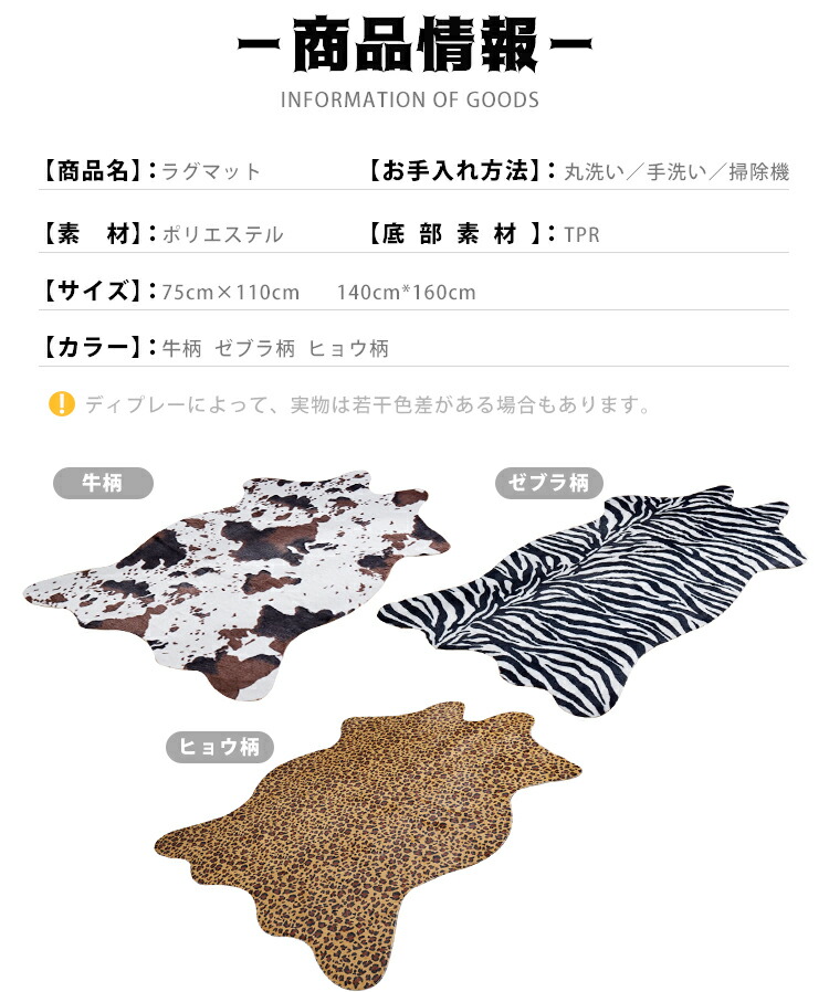 ラグ ラグマット カーペット シャギー 75×110cm 140×160cm 牛柄 ゼブラ柄 ヒョウ柄