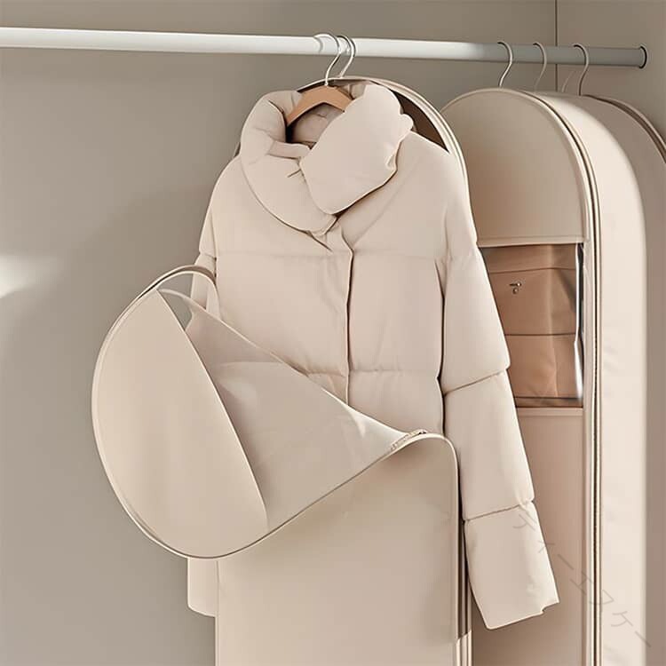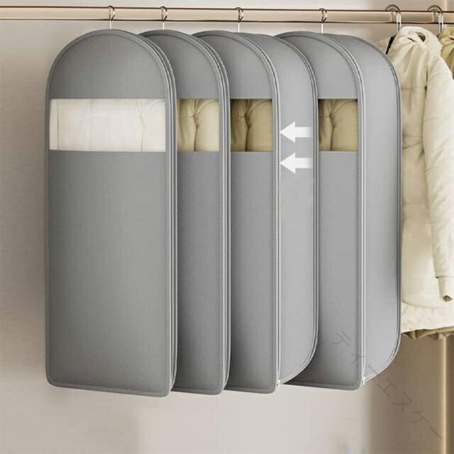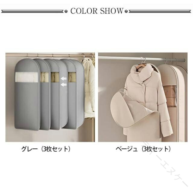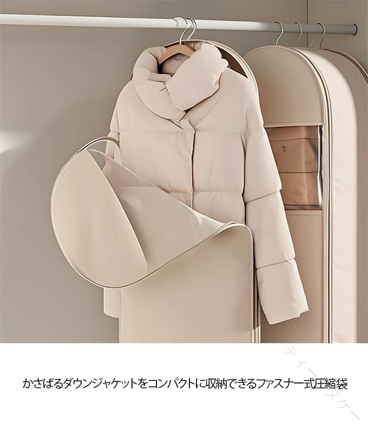 .3点セット 衣類圧縮袋 と 衣類カバー は ロングサイズ の ファスナー式 で 吊り下げ 収納 が可能です。ジャケット や ダウンジャケット、ダウンコート、コート などの 洋服カバー として最適で、収納 と 整理、ほこりよけ に役立ちます。無地 仕様 の 圧縮バッグ は 洋服収納袋 としても使いやすく、衣替え や 引越し にも便利です。。