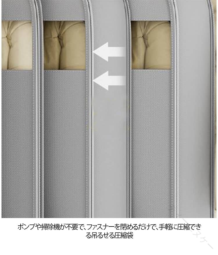 ダウンを傷めず、約40%スペース節約♪・2枚セットかさばるダウンジャケットをコンパクトに収納できるファスナー式圧縮袋。一部の生地が透明になっているので、何を入れたか一目でわかります。ポンプや掃除機が不要で、ファスナーを閉めるだけで、手軽に圧縮できる吊るせる圧縮袋。吊り下げ圧縮袋はコートやロングコート、ジャケット等の洋服をスッキリ収納。透明窓付き、中身が見えるおで、収納した衣類がすぐに見つかることができる衣類圧縮袋。1つの吊るせる圧縮袋に約3-5枚のコートやジャケットを収納できる。吊り上げ圧縮袋は縦のスペースを利用、クローゼット内の収納スペースがぐっと広がる。使わないときは折りたためるのでスペースをとりません。出張、旅行などのアウトドアにもご利用いただけます。