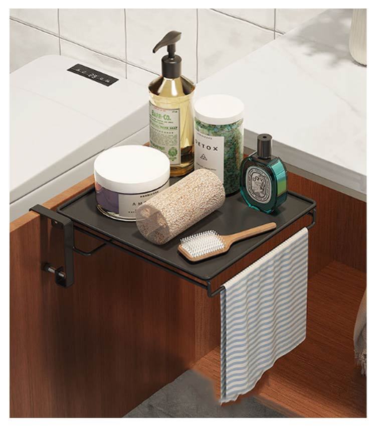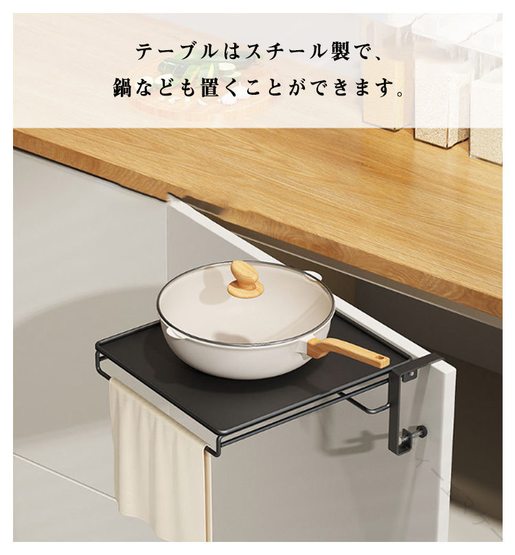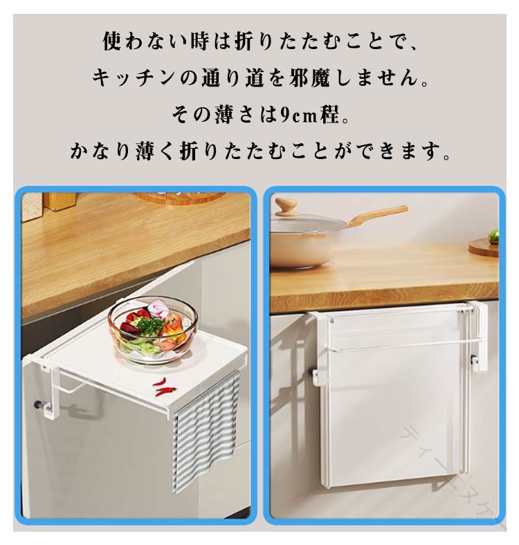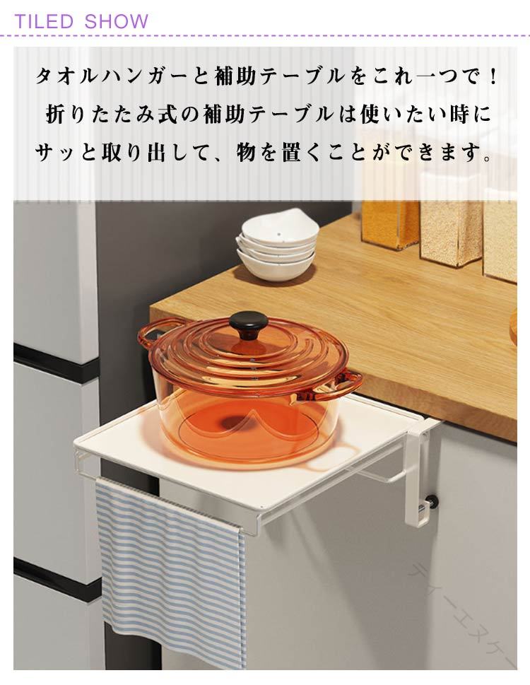 折りたたみ補助テーブル&タオルハンガータオルハンガーと補助テーブルをこれ一つで!折りたたみ式の補助テーブルは使いたい時にサッと取り出して、物を置くことができます。ちょっとした作業スペースとして、狭いキッチンや台所で、料理の材料を置いたり、鍋を置いたり、タオル掛け、ふきん掛けとしてご使用頂けます。折りたたみ作業台として、キッチン以外でも、脱衣場、洗面台、リビング、書斎などでご利用頂けます。一人暮らしにはとても便利な商品です。取り付けは扉などに掛けるだけで簡単設置!ご家庭の扉の厚みに合うように、ネジ部で微調整ができます。使わない時は折りたたむことで、キッチンの通り道を邪魔しません。その薄さは9cm程。かなり薄く折りたたむことができます。テーブルはスチール製で、鍋なども置くことができます。コンパクトな作業台ですが、耐荷重は約6kgで、使用時の安定感が高く、使用できる場面も多くなります。
