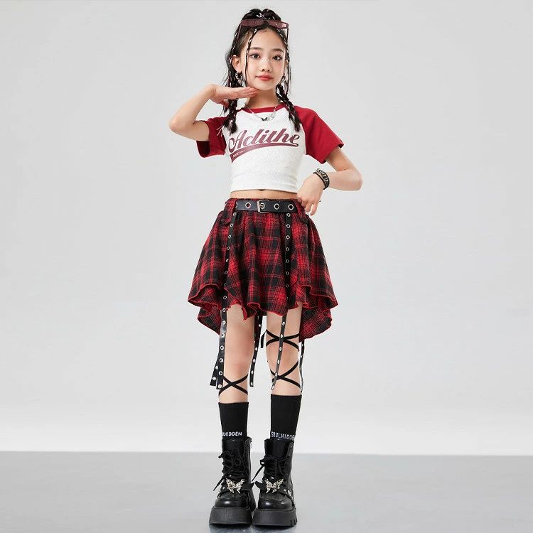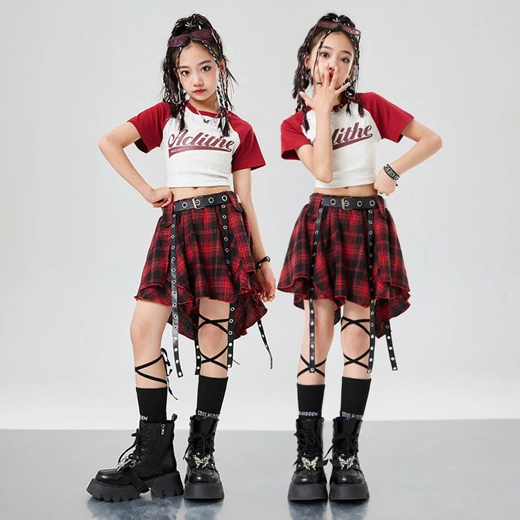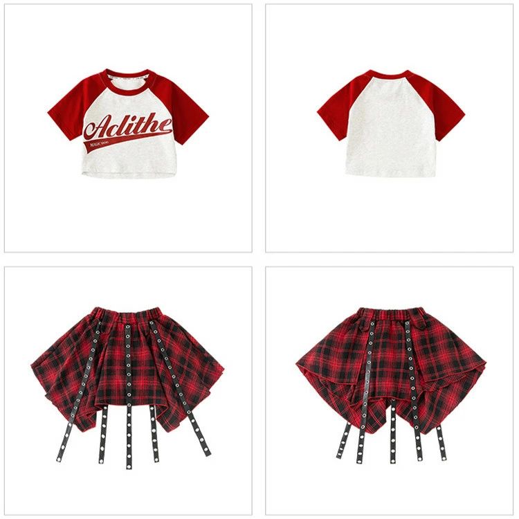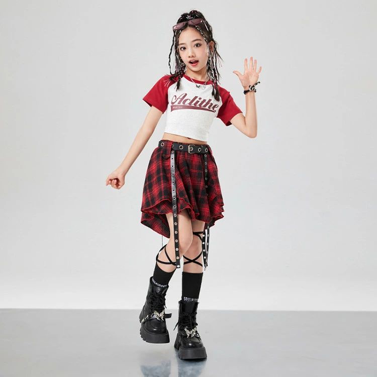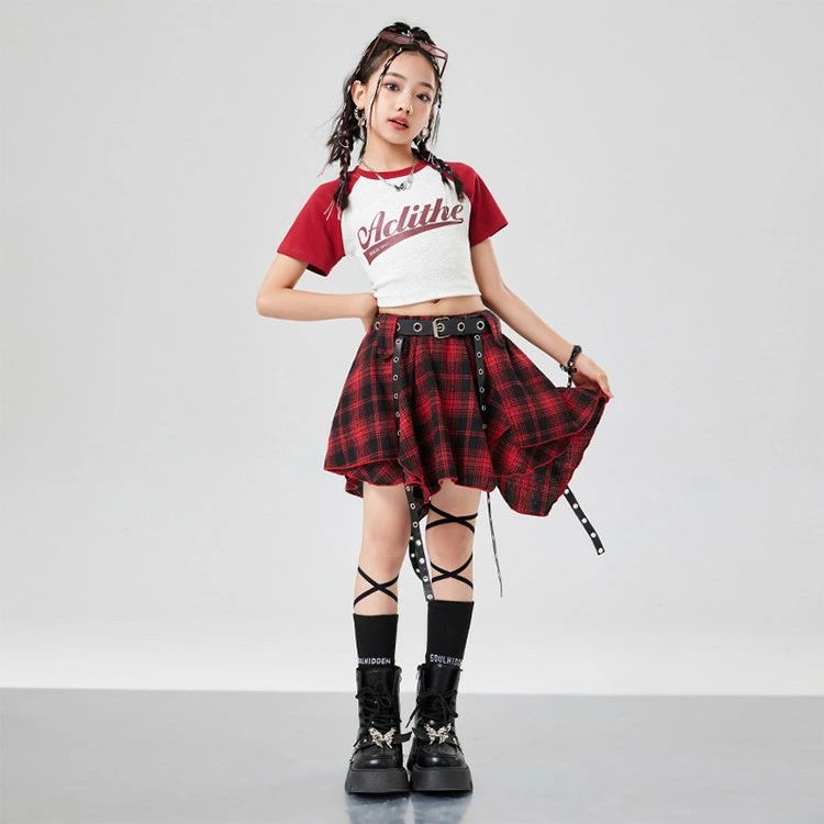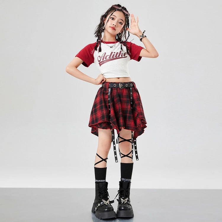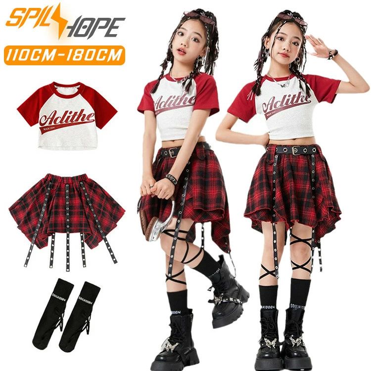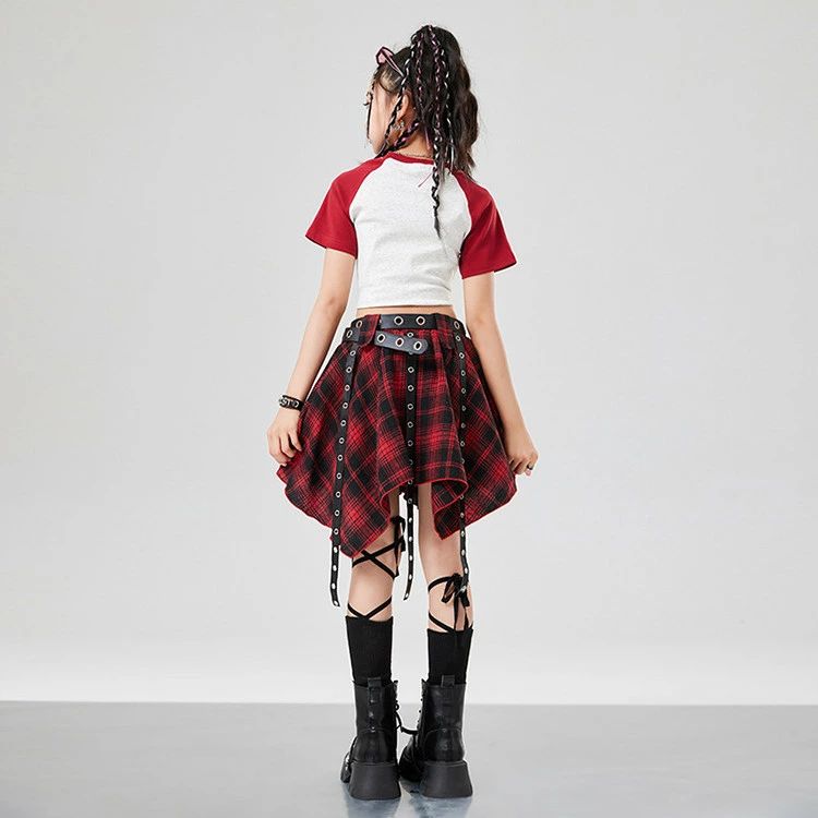 チェックスカート 総柄 レッド ショートトップ 女の子 セットアップ JAZZ ジャジーダンス HIPHOP K-POP 韓国 チアガール チアリーダー チェック柄 ダンス衣装 赤色 tシャツ キッズ
