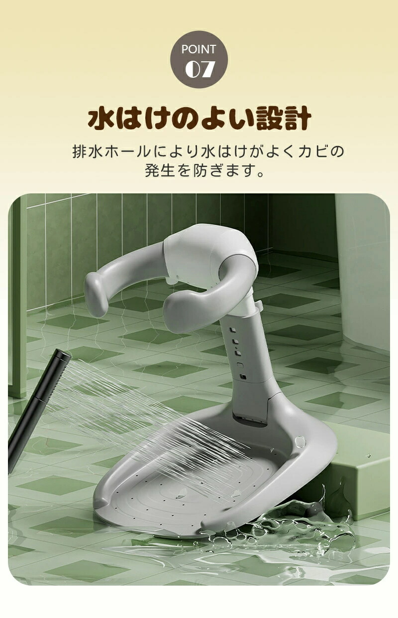 シャワーが掛けられるシャワーホルダーも付いていて、入浴時のサポートが充実しています。