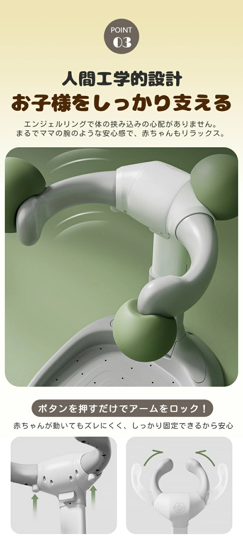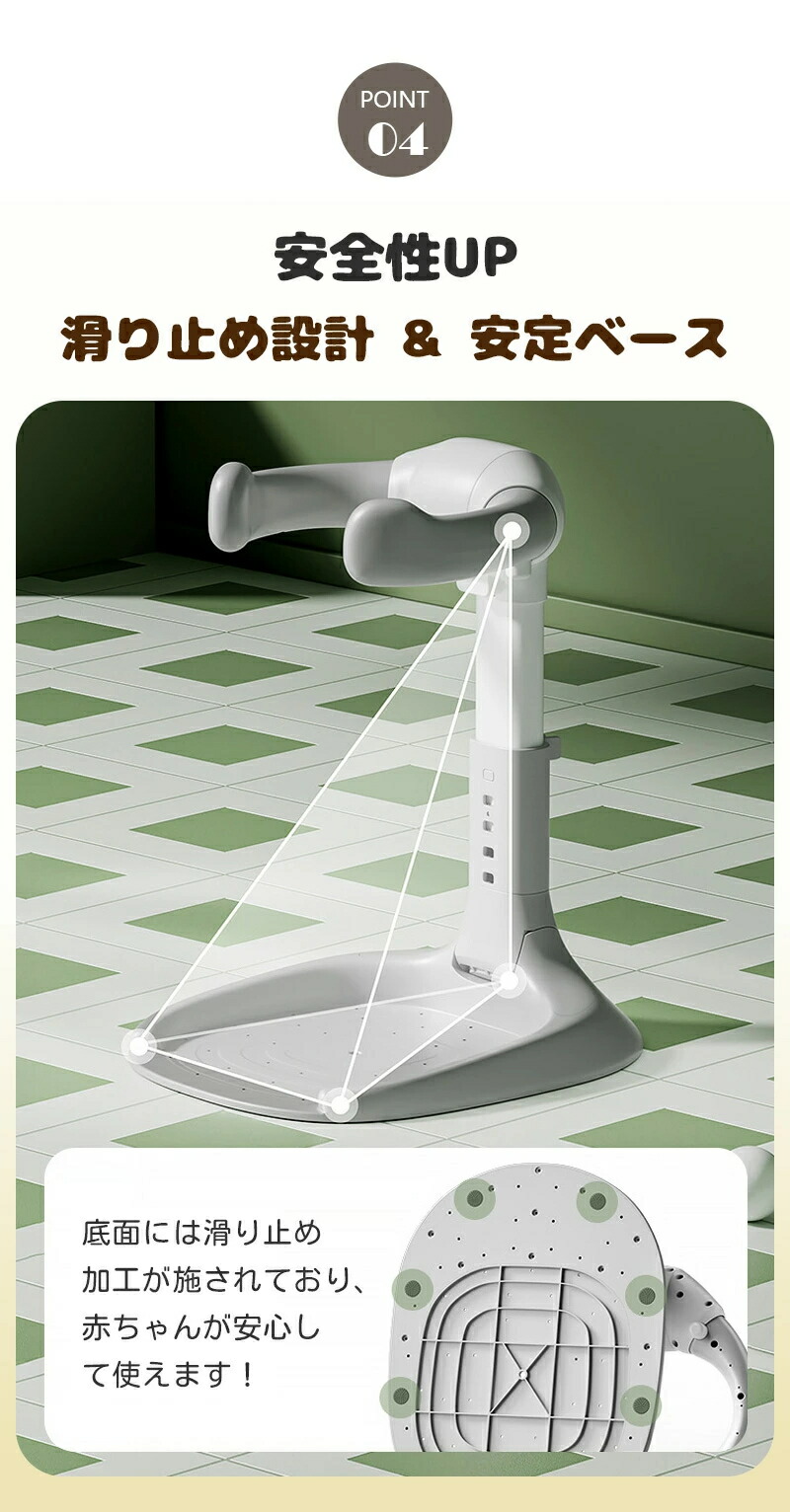 エンジェルリングや床面、表面にはすべり止め加工が施されており、転倒のリスクを軽減します。