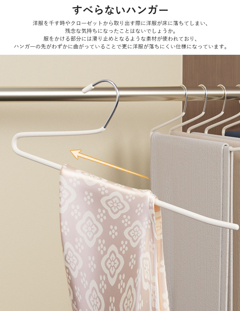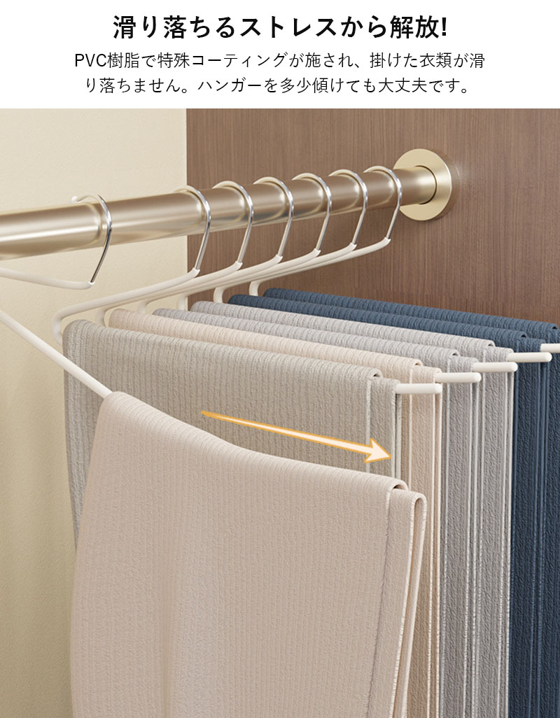 スチール製のハンガー本体にPVC樹脂で特殊コーティングが施され、掛けた衣類が滑り落ちません。