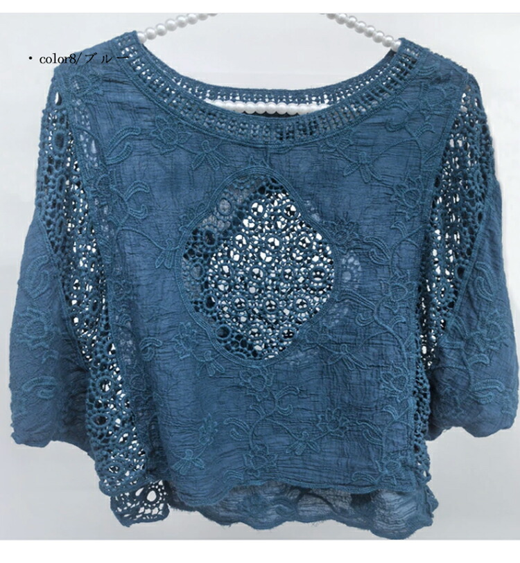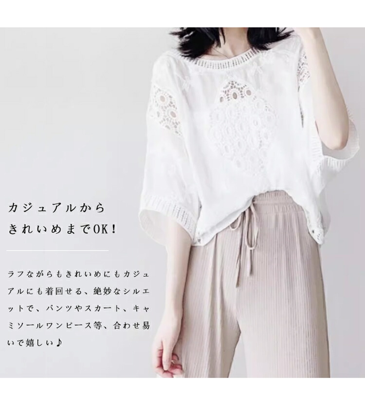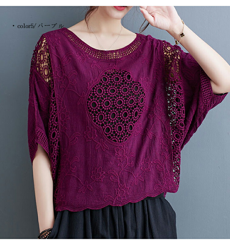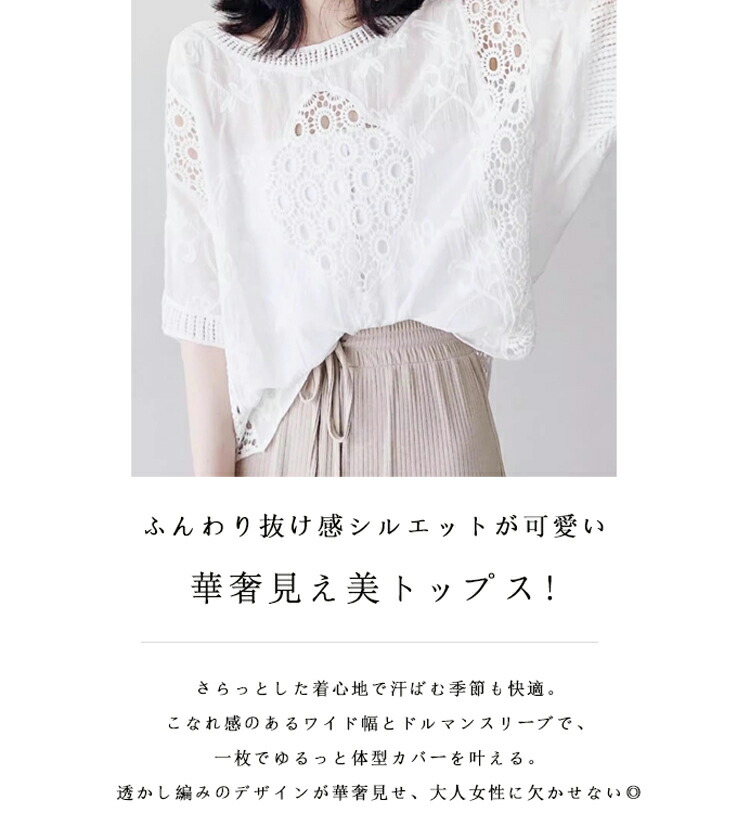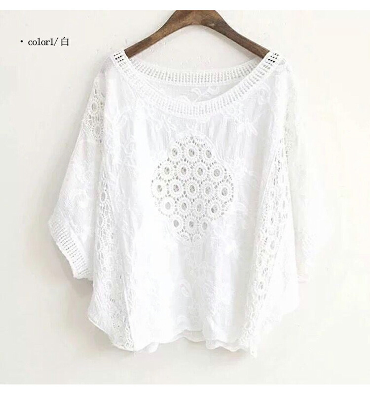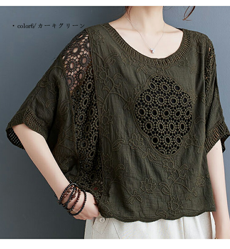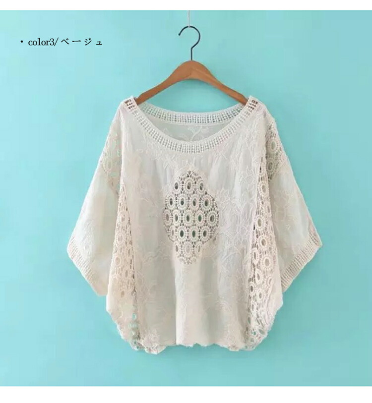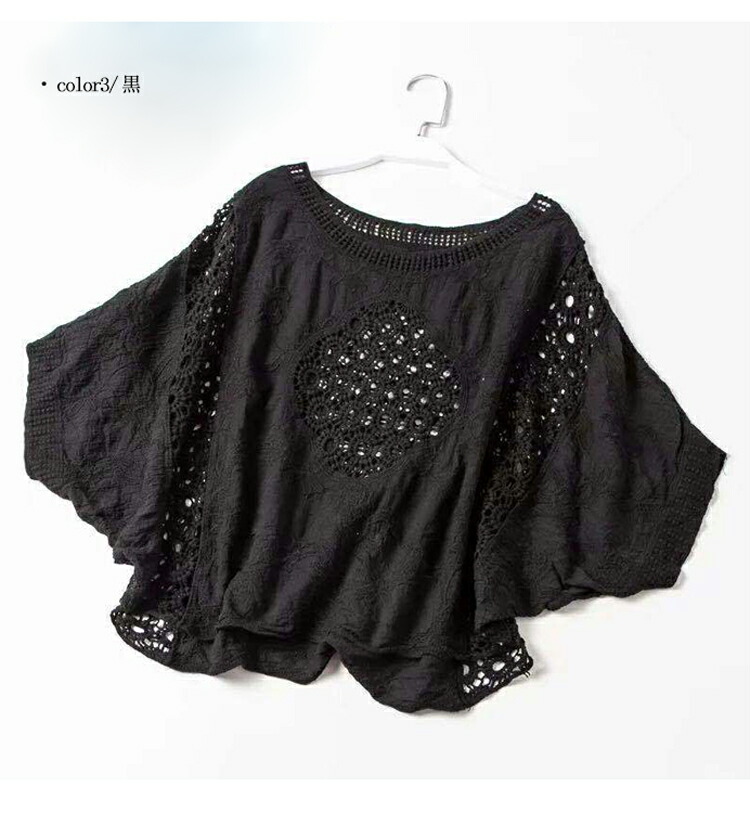 ドルマン レースブラウス 春 夏 レデ トップス Tシャツ カットソー 人気 白 黒 白+黒 ベージュ パープル カーキグリーン グリーン ブルー