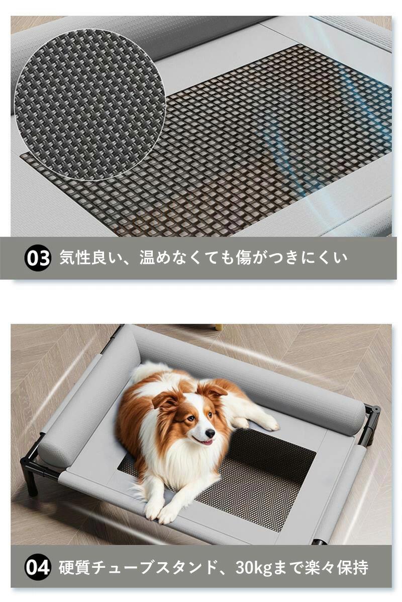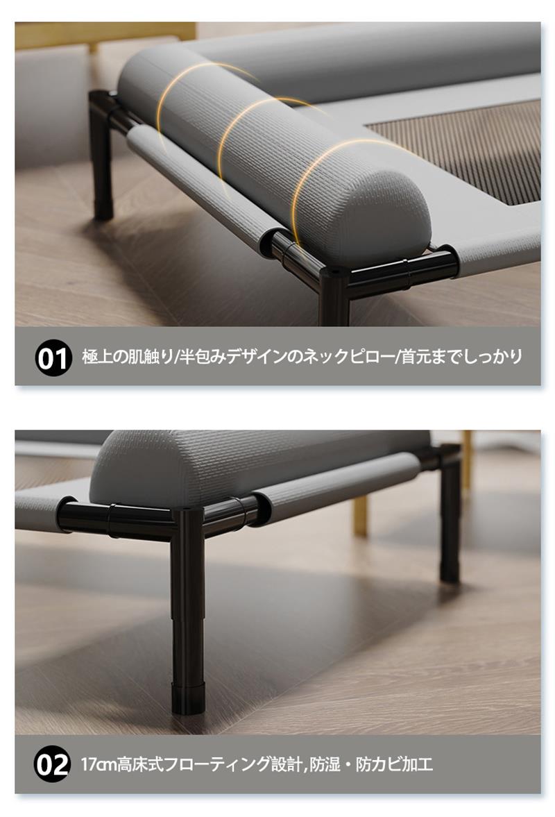 【耐久性と頑丈さ】壊れにくい犬用ベッドの寿命を延ばすため、ベッドフレームの破損を効果的に防ぎます。この犬用高床式ベッドは最大150ポンド(約70kg)まで支えることができ、犬にとって安全で快適な休息場所を提供します。