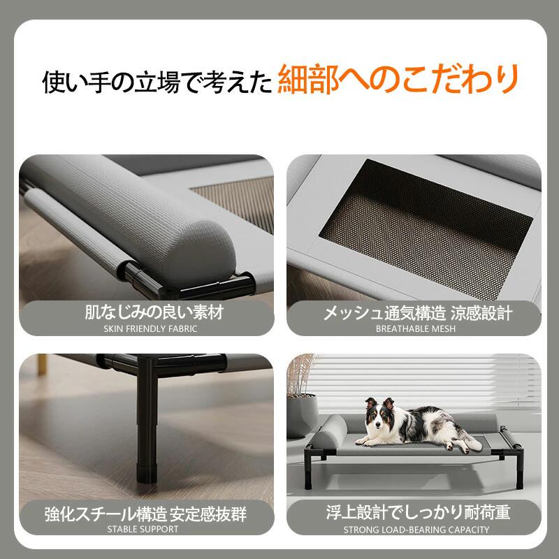【滑り止め加工で安定性】メッシュ素材と床から離れた足付きデザインで、通気性放湿性に優れ、夏は涼しく冬は冷えを防ぎ、滑り止め加工で安定性も抜群!愛犬の健康と安眠をトコトン追求した機能性ベッドです。