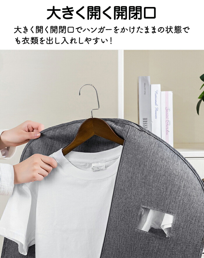 正面ファスナー付きで衣類を出し入れしやすい。ハンガーにかけたままでも出し入れが難しくないので手間要らずです。
