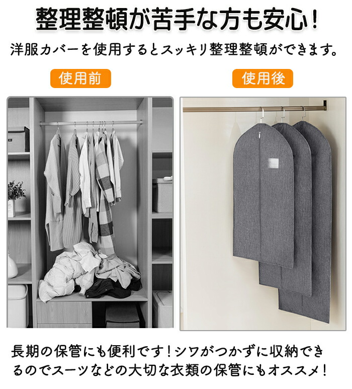 衣類がぐちゃぐちゃでどこに何があるかわからないクローゼット内の整理整頓にもオススメです!衣類をカバーに入れることでスッキリ見えクローゼット内も綺麗な見た目とより多くの物を収納できます。