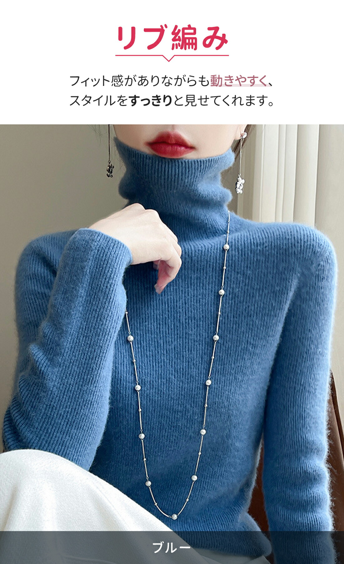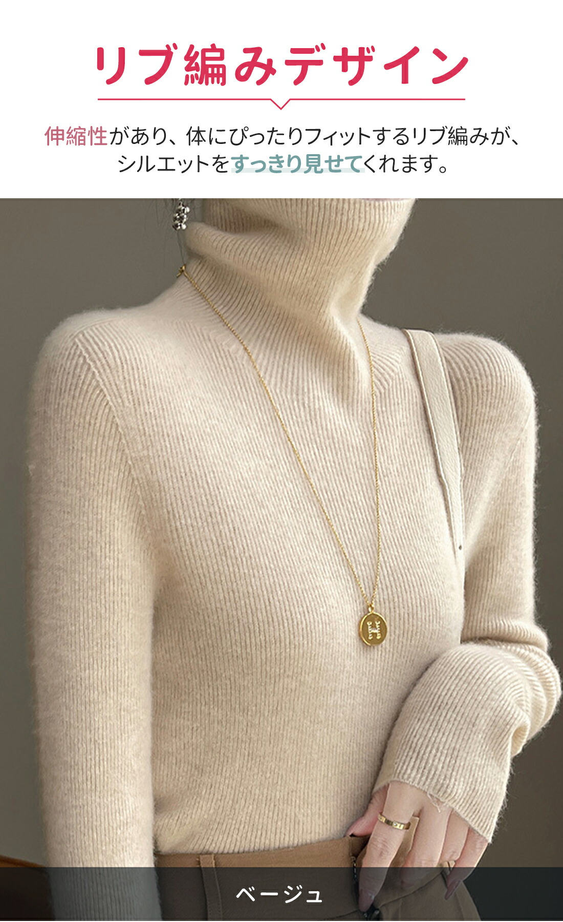 リブ編み: フィット感がありながらも動きやすく、スタイルをすっきりと見せてくれます。
