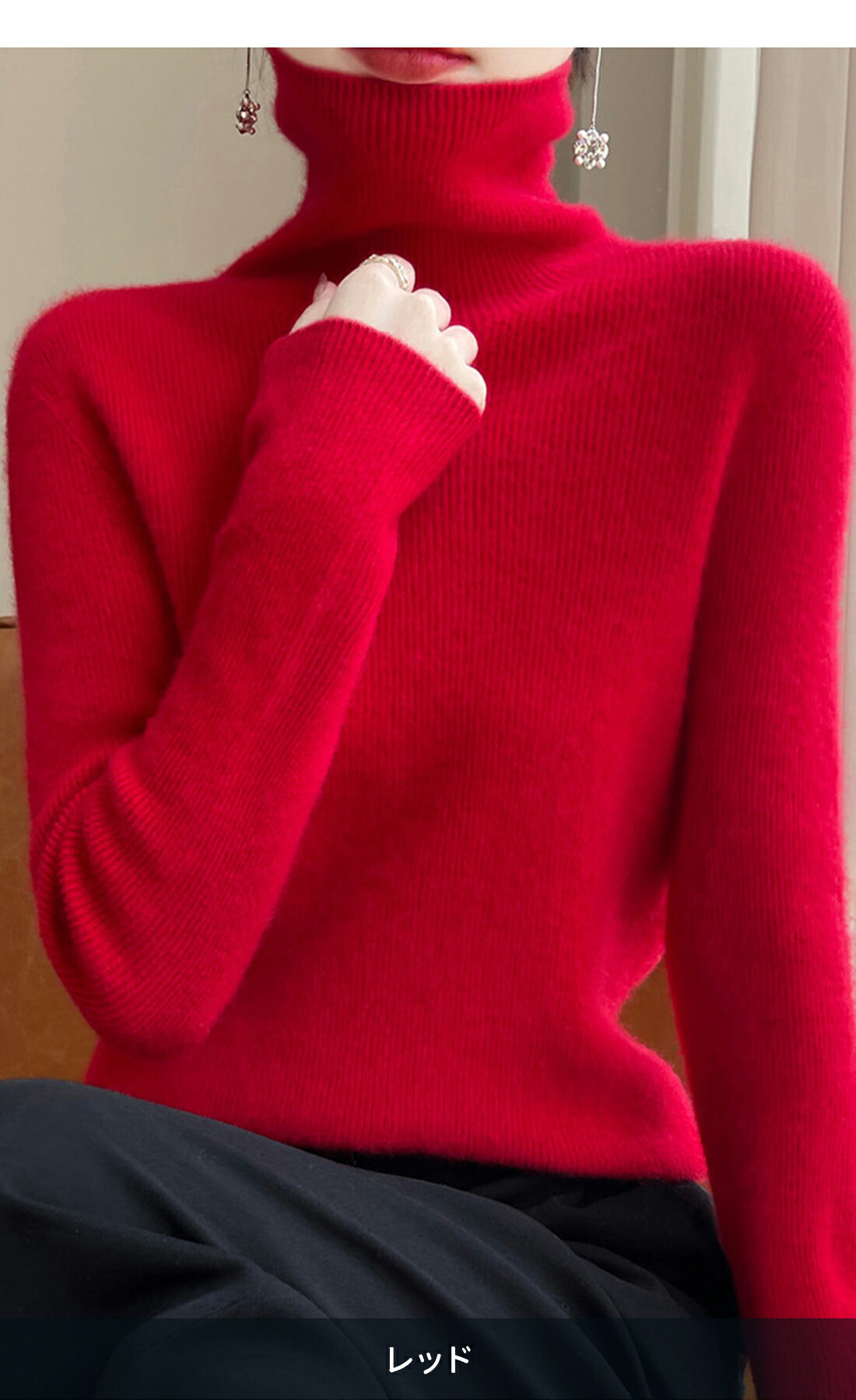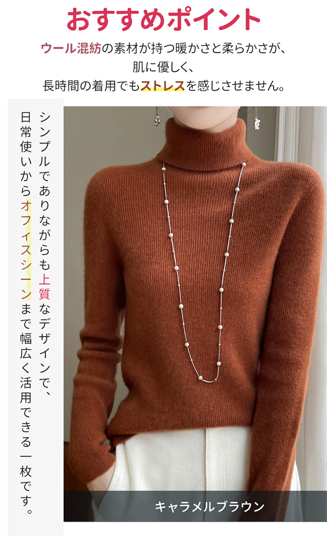 素材: ウール混紡の柔らかいニット素材を使用し、暖かさと軽やかさを両立。