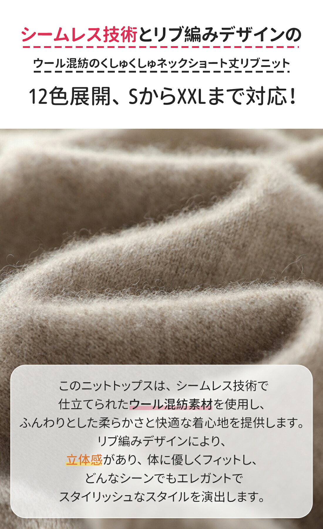 シームレス技術とリブ編みデザインのウール混紡のくしゅくしゅネックショート丈リブニット - 12色展開、SからXXLまで対応!