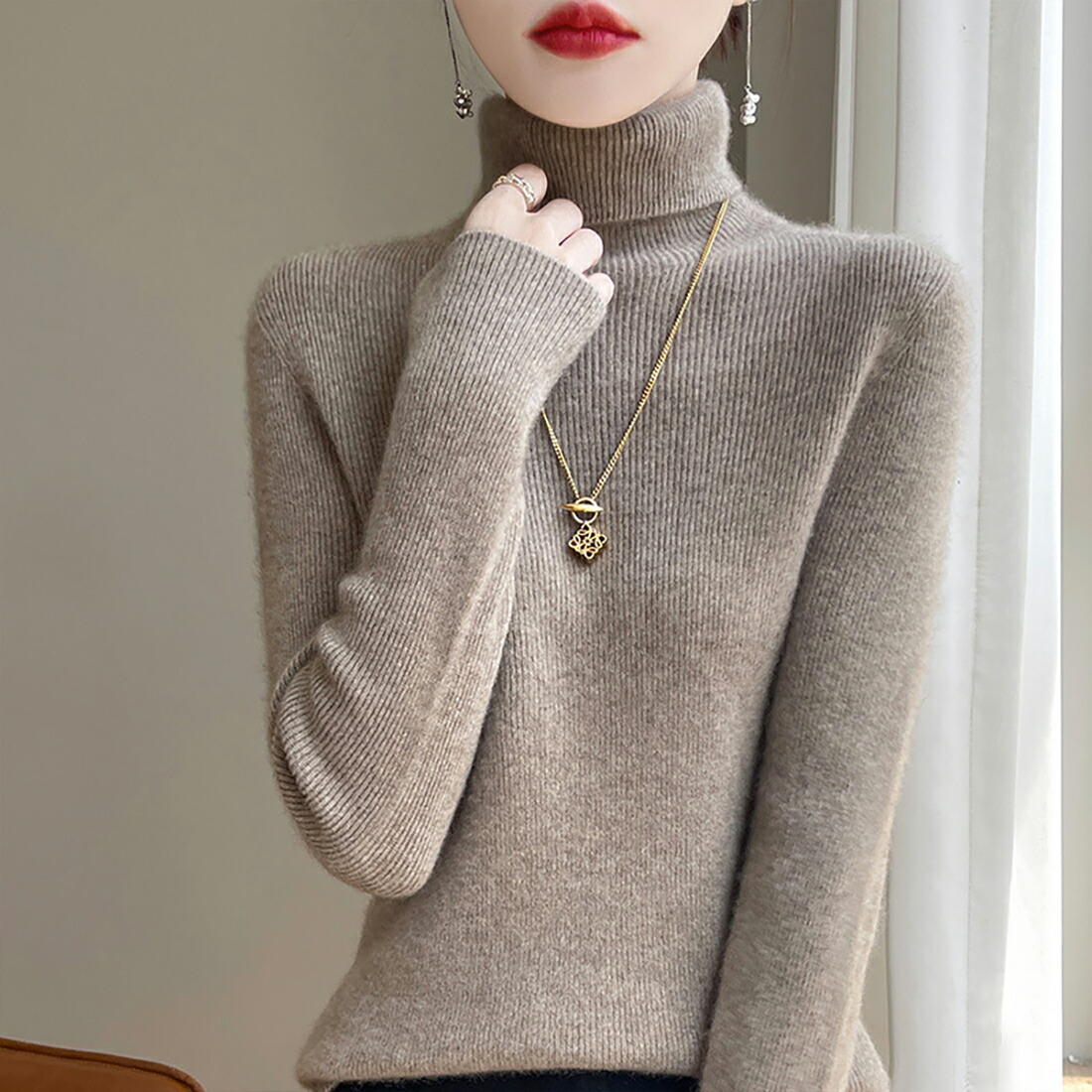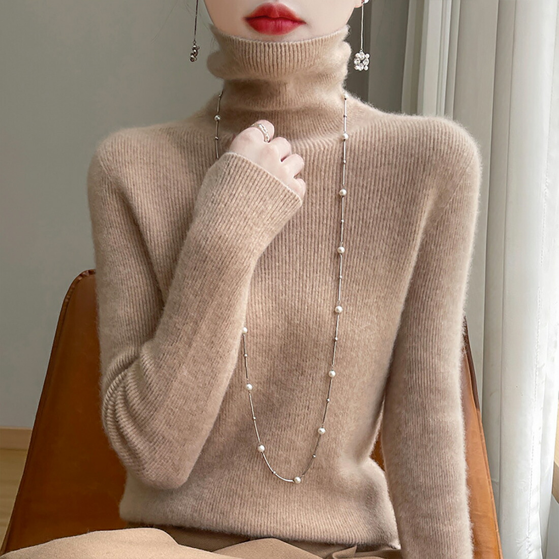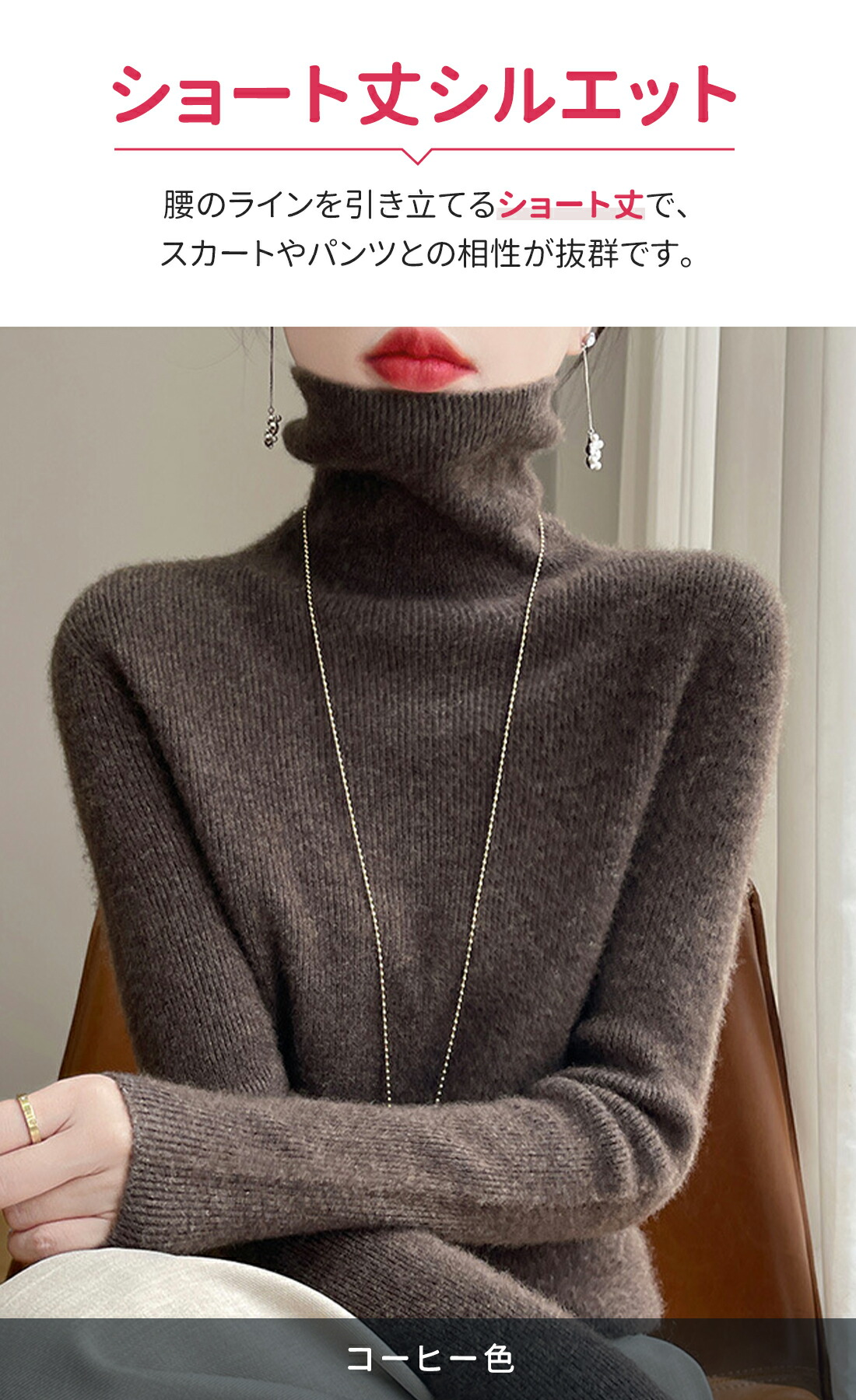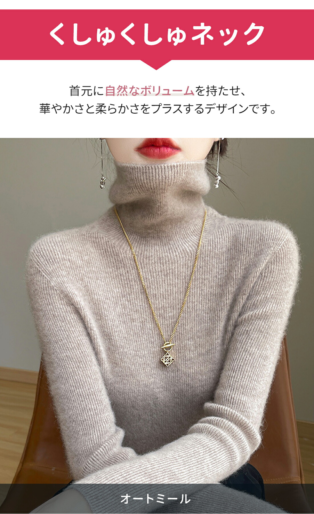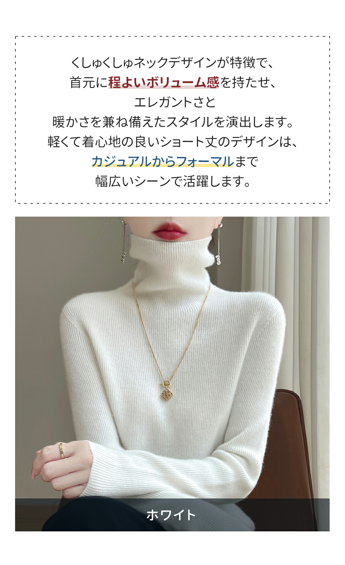 くしゅくしゅネックデザインが特徴で、首元に程よいボリューム感を持たせ、エレガントさと暖かさを兼ね備えたスタイルを演出します。