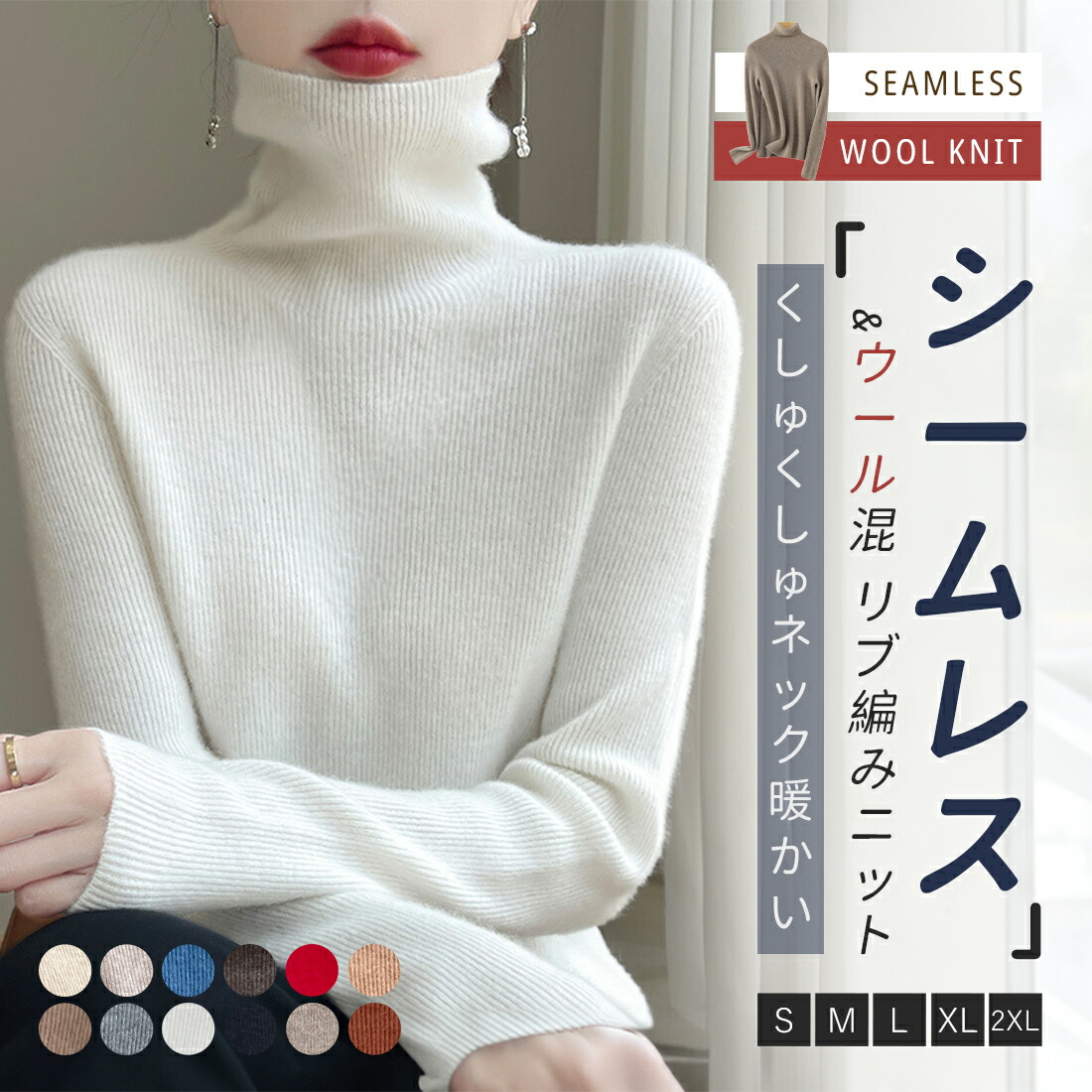 このニットトップスは、シームレス技術で仕立てられたウール混紡素材を使用し、ふんわりとした柔らかさと快適な着心地を提供します。