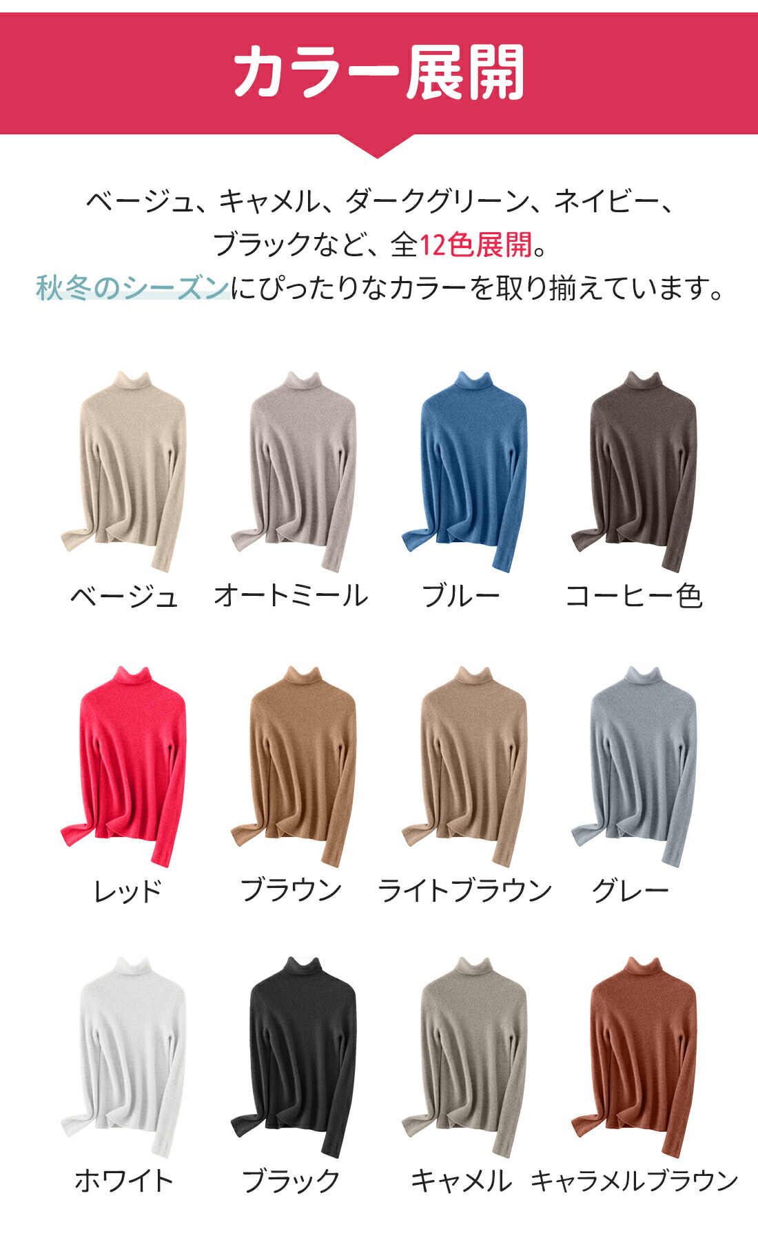 カラー展開: ベージュ、キャメル、ダークグリーン、ネイビー、ブラックなど、全12色展開。秋冬のシーズンにぴったりなカラーを取り揃えています。
