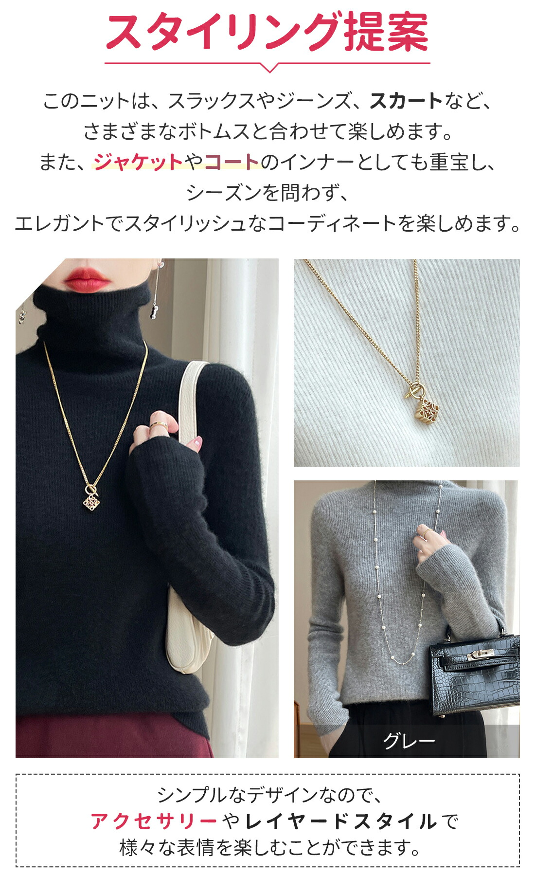 シンプルなデザインなので、アクセサリーやレイヤードスタイルで様々な表情を楽しむことができます。