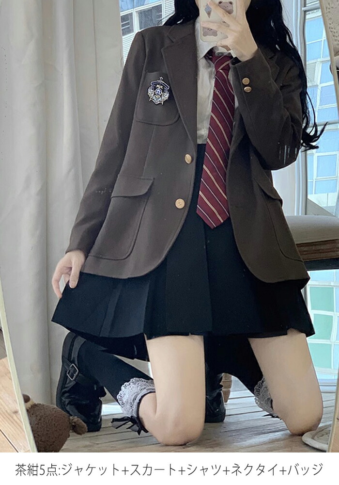 商品名:卒業式 スーツ 女の子 韓国 卒服 ブレザー 高校生 入学式 スーツ 女子 中学生 フォーマルスーツ ジャケット スカート シャツ ネクタイ リボン バッジ 大きいサイズ ピアノ発表会 ブラウン 黒 5点セット スカート ブラウス 白シャツ ネクタイ JK 七五三 撮影 XS-2XL
