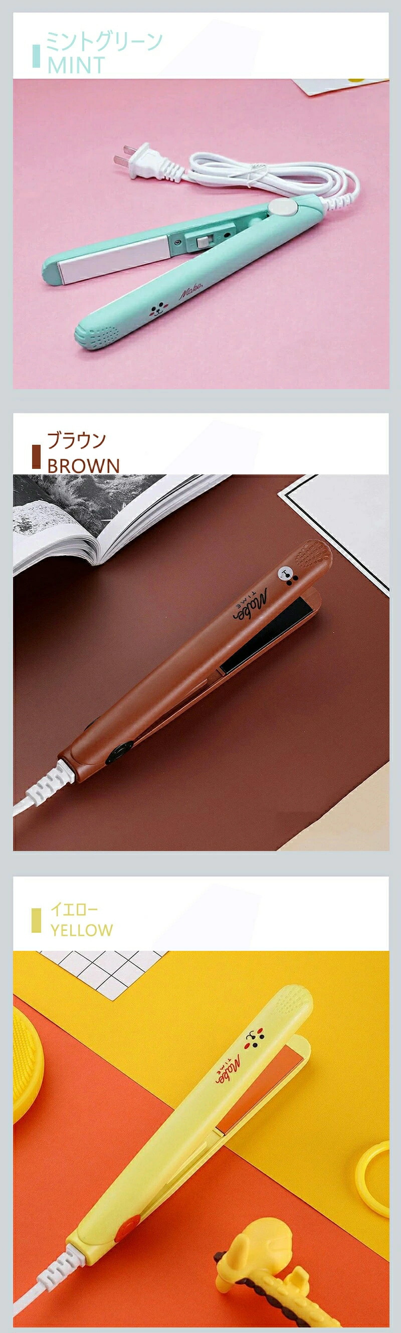 ヘアアイロン ミニ ストレートアイロン ピンク ホワイト ブラウン イエロー ブルー パープル ミントグリーン