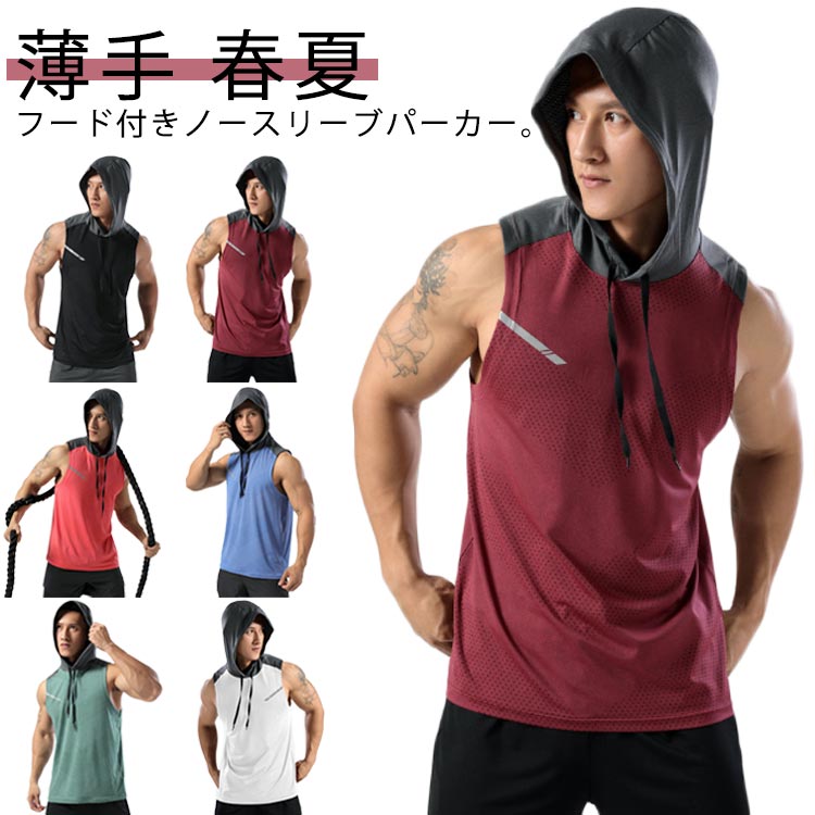ノースリーブ パーカー タンクトップ メンズファッション 続々登場 ブラック ワイン オレンジ ブルー グリーン ホワイト M L XL 2XL 3XL