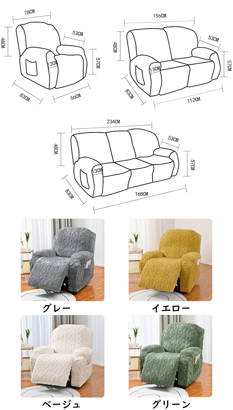 リクライニングチェアカバー 秋冬 リク グレー イエロー ベージュ グリーン 1人乗り(4枚) 2人乗り(6枚) 3人乗り(8枚)