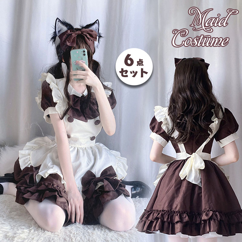 ハロウィン 衣装 メイド服 セクシー 可愛い 仮装 コスプレ コスチューム レディース リポン カチューシャ エプロン ゆめかわ 半袖 スカート ホワイト ブラウン イベント カフェ バレ パーティー