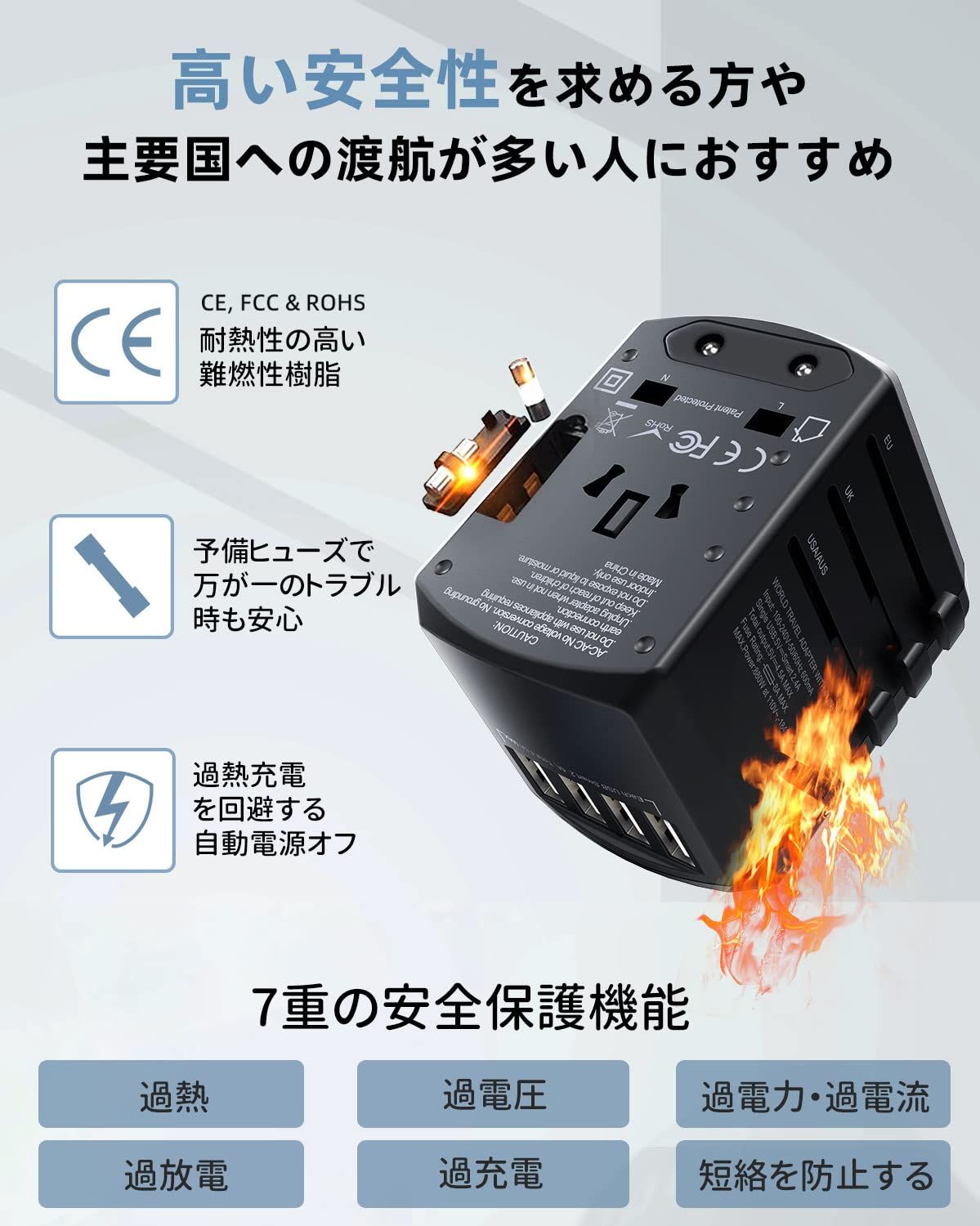 『安全性も抜群』:トラベル用変換プラグアダプターはROHS、CEおよびFCC認証済、安全を確保できます。この海外コンセントプラグは高品質のチップを採用により、過充電、過放電、過熱、ショートの場合、自動的に充電を停止して、デバイスを保護できます。多種保護システムやプロな難燃材料を使用し、トラッキング火災予防にも効果的です。また、LEDランプを搭載し、夜や暗い場所でも充電状況が確認できます。安心して使えるので旅行や出張もストレスがなく行えます。