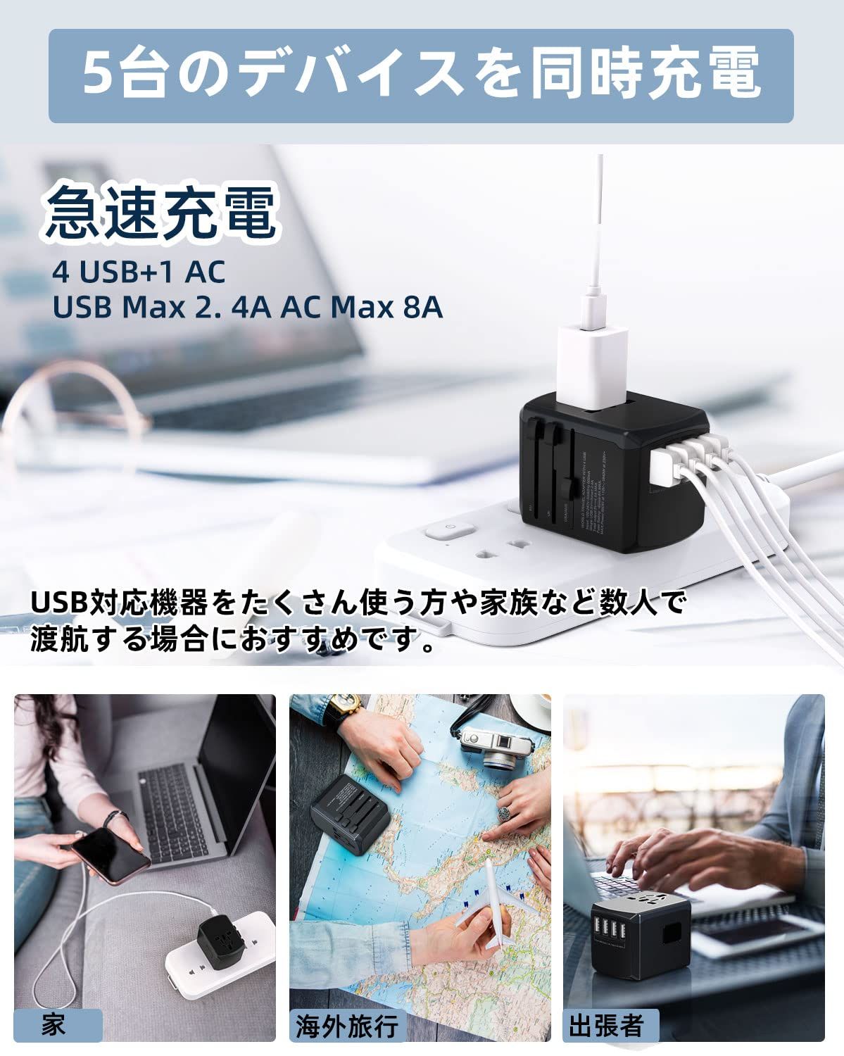 『幅広い電気製品に対応』:スマホ、PCパソコン、カメラ、シェーバー、タブレットなど様々な旅行デバイスに対応できます。なんと1台の充電器で5台のデバイスを同時充電できちゃうんです!AC100V-240Vのグローバル電圧対応、変圧機が不要で色々な国に対応しており使い勝手もよいです。一つあるだけでも十分な性能があります。注意:本製品は変圧器ではなく変換器です。