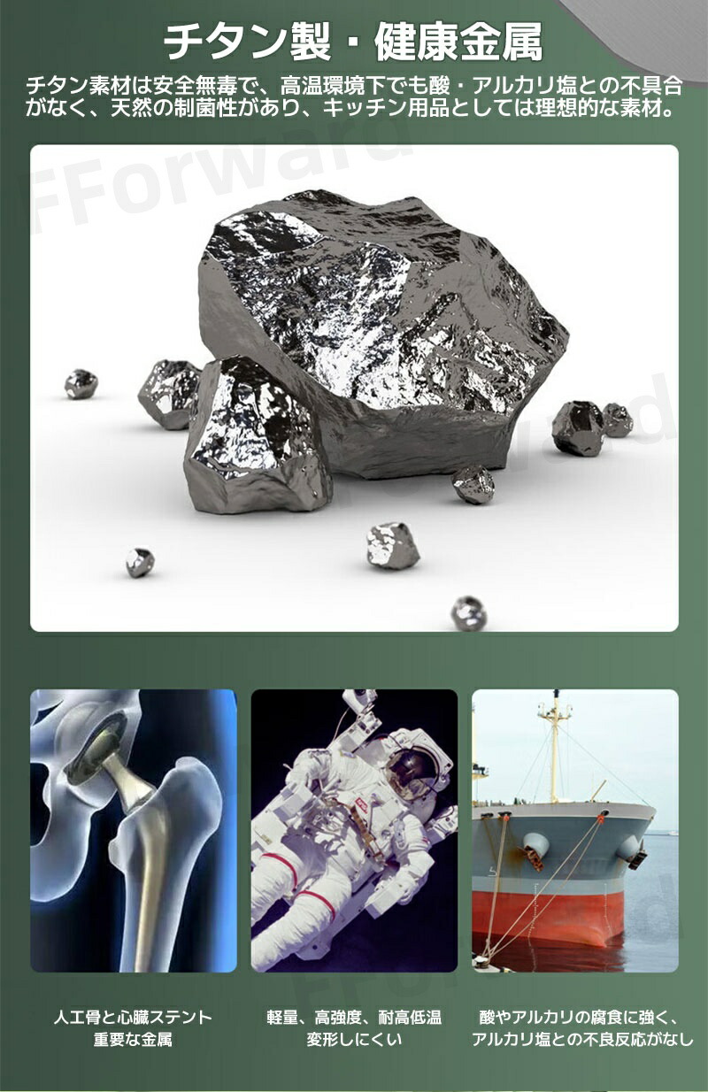 チタン表面の酸化被膜(二酸化チタン)が細菌繁殖を抑制。JIS規格(抗菌加工製品)適合の衛生基準をクリアしたプロ仕様です。