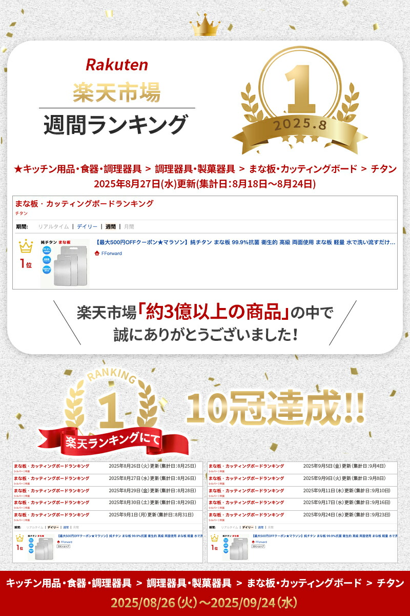 高純度チタン(99.6%以上)を使用した超高級まな板。サビ・カビ・細菌に強く、10年以上の長期使用が可能。従来のまな板素材を超える耐久性を実現しました。