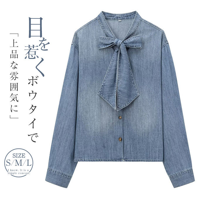 ボウタイ シャツ ブラウス デニム レディース 長袖 春 夏 秋 羽織 デニムシャツ シャツブラウス デニムブラウス リボンタイ トップス 前開き 着回し 春夏 カジュアル