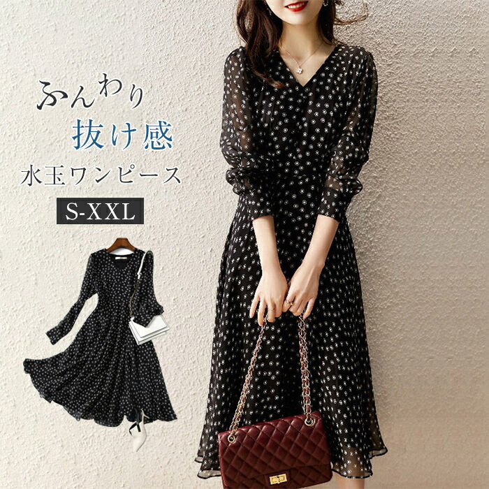 ワンピース ロングワンピース レディース 春 秋 長袖 総柄 水玉 ドット ハイウェスト ミモレ丈 フレア ワンピ オフィス フォーマル ゆったり 可愛い フェミニン 体型カバ カジュアル