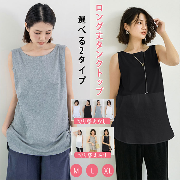 タンクトップ トップス レディース ロング丈 ノースリーブ スリット ゆったり お尻カバー 体型カバー 選べる2タイプ 切り替えあり なし 通年 アウター レイヤード 袖なしTシャツ カ 重ね着