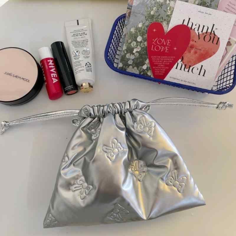 巾着バッグ 収納ポーチ 蝶結び リボン レザー 風 キルティング コットン 素材 日常使い 旅行用 入れ 軽量 コンパクト 生理用品