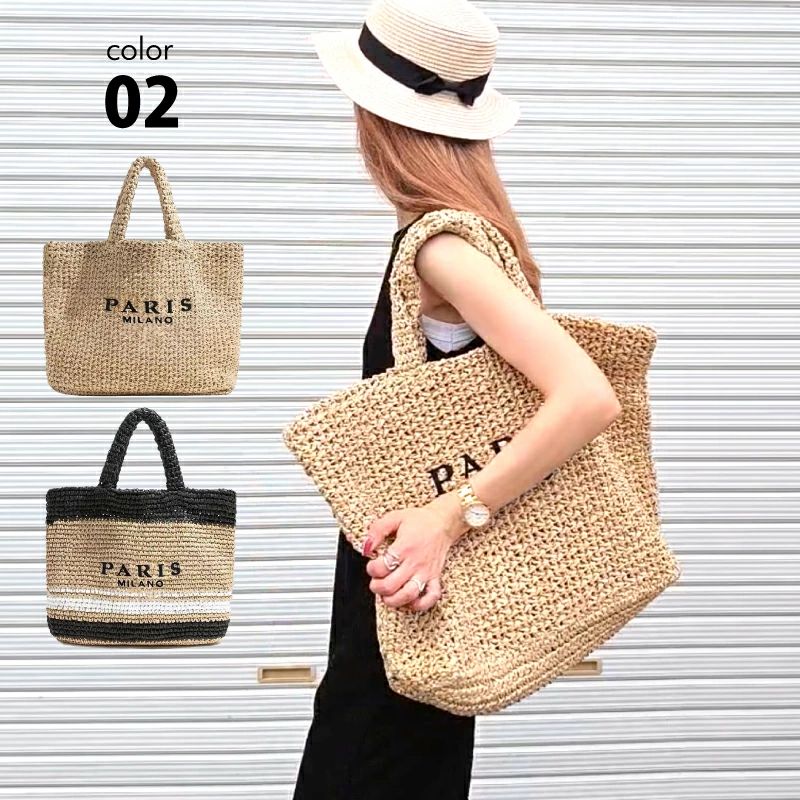 カゴバッグ ハンドバッグ ロゴ トート かごバッグ レディース PARIS MILANO [ 編み込み ストローバッグ トートバッグ 夏 軽い かわいい ハンドメイド ママ ママバッグ 軽量 リゾート