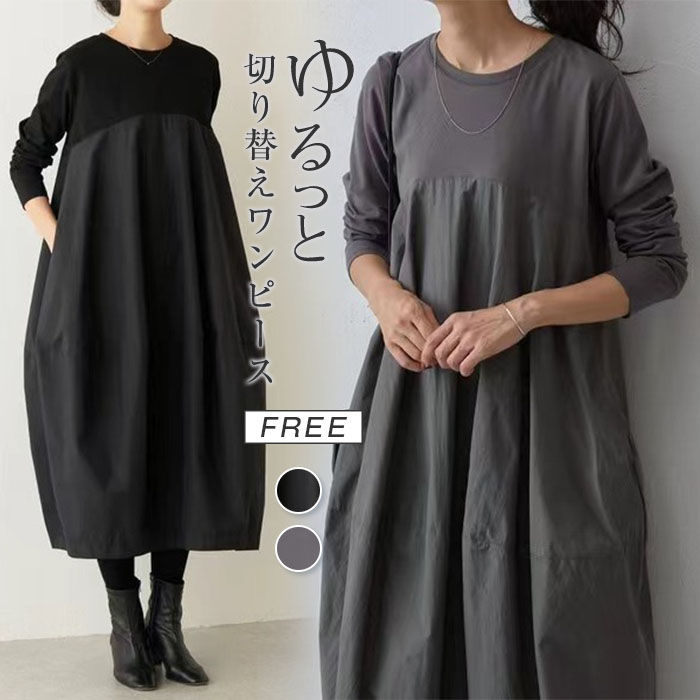 ワンピース コクーンワンピース レディース 長袖 秋 ロング 長袖ワンピース ロングワンピース Aライン コクーン 着痩せ 無地 オシャレ オフィス 切り替え ポケット付き 体型 ゆったり