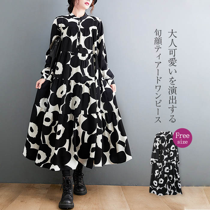 総柄 シャツ ワンピース 長袖 シャツワンピース ロング ティアードワンピース aラインワンピース ティアード ロングワンピース フレアワンピース 大きいサイズ ゆったり フレア 春 秋 切 aライン
