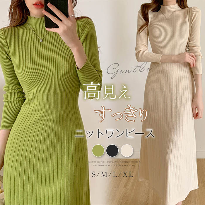 ニットワンピース ニット ワンピース ロングワンピース レディース ハイネック 秋 冬 膝下丈 体型カバー 無地 マキシ丈 ニットワンピ リブニット フェミニン 気質 ゆったり 暖か 通勤