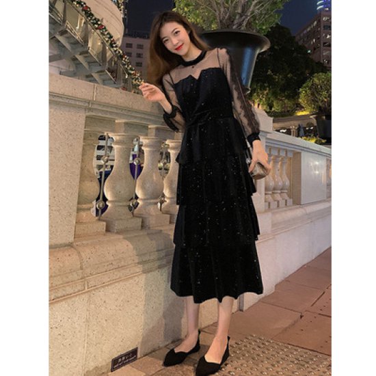パーティードレス レディース ワンピースドレス 結婚式ドレス 演奏会ドレス お呼ばれ フォーマル パーティー きれいめ メッシュ ティアードスカート ラウンドネック ハイウエスト シースルー