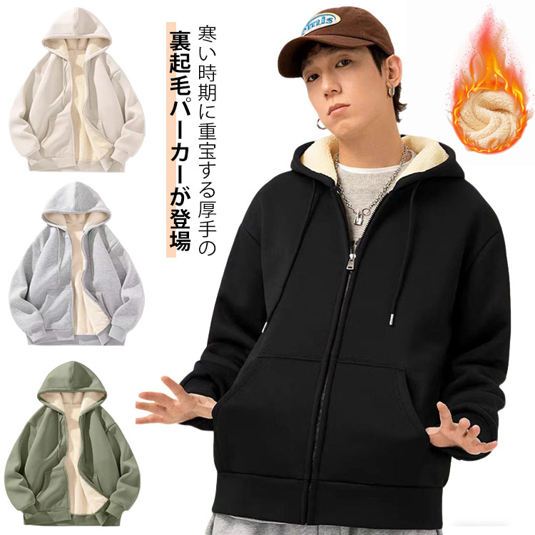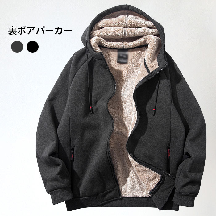 ボアパーカー メンズ あったか 長袖パーカー 裏起毛 暖かい ジップパーカー トップス 厚手 アウター 無地 裏ボア