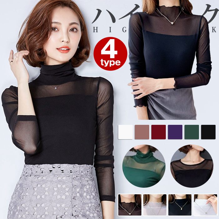 シースルー トップス チュール インナー ハイネック ネック レディース ブラウス 長袖 カジュアル セクシー 透けレース 無地 エレガントシャツ フェミニン 新タイプ追加