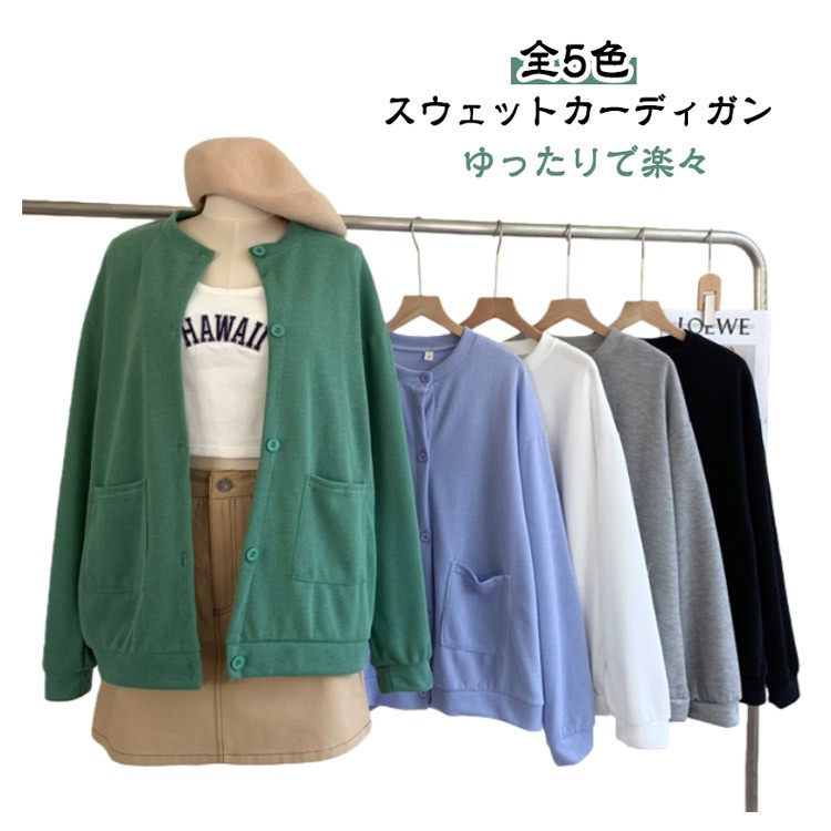 スウェットカーディガン レディース 長袖 ノーカラー ゆったりビッグシルエット ドロップショルダー 薄手 秋 アウター 綿混 大きいサイズ カジュアル