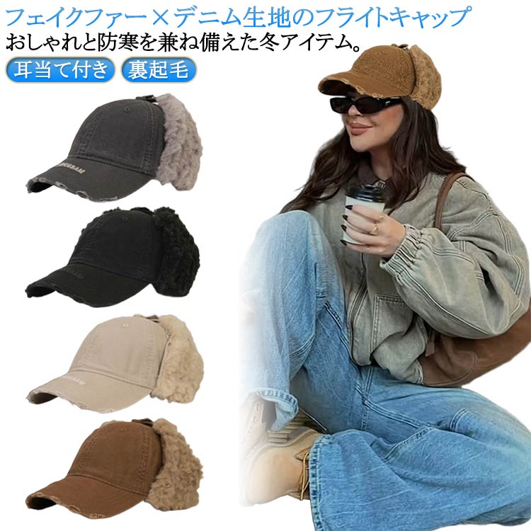 裏起毛 耳当て付き キャップ 裏ファー ファー フライトキャップ デニム調 秋冬 レディース 防寒 メンズ 飛行帽 パイロットキャップ 帽子 ふわふわ あったか イヤーマフ 耳あて もこもこ