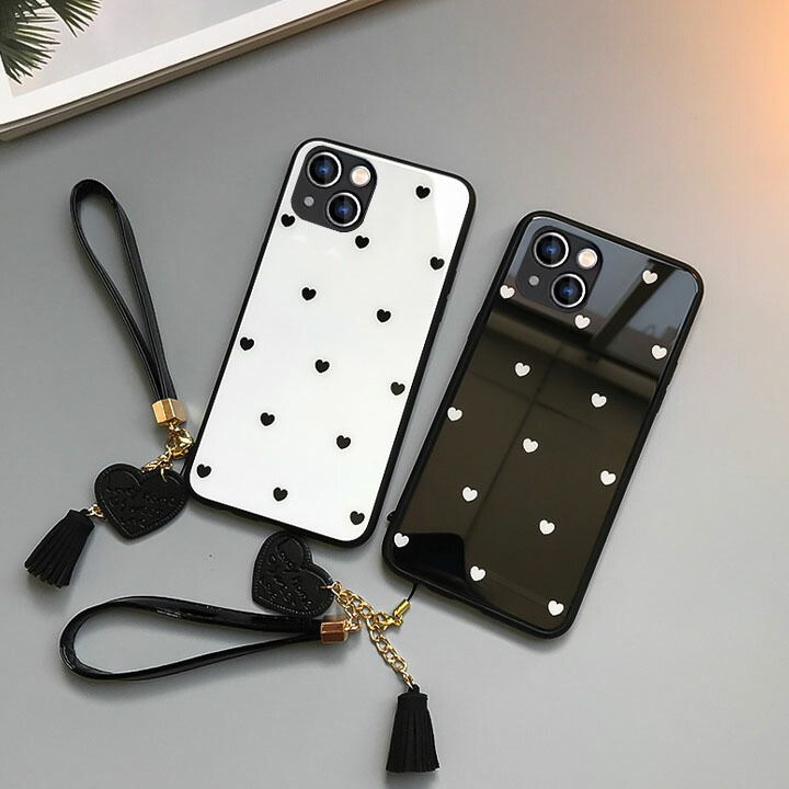 iPhone17ケース ハート ドット 白黒 iPhoneケース ストラップ付 ハードケース チャーム付き 光沢 iPhone16 iPhone15 iPho iPhone17