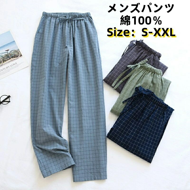 パジャマ パンツ メンズ 綿100% 薄手 ダブルガーゼ ルームパンツ チェック柄 長ズボン ボトムス ウ 2重ガーゼ